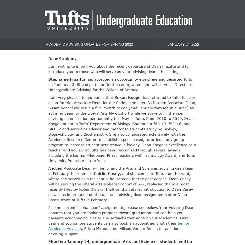 Another Associate Dean will be joining the Arts and Sciences advising dean team in February. Her name is Caitlin Casey, and she comes to Tufts from Harvard, where she served as a residential house dean for the past decade. Dean Casey will be serving the Liberal Arts alphabet cohort of S–Z, replacing the role most recently filled by Robin Olinsky. I will send a detailed introduction to Dean Casey as well as information on the updated advising dean assignments after Dean Casey starts at Tufts in February.