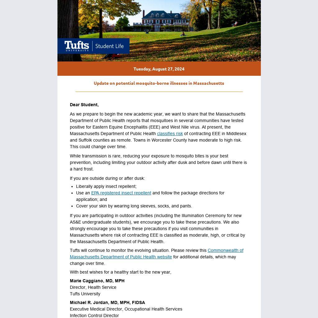 Tufts will continue to monitor the evolving situation. Please review this Commonwealth of Massachusetts Department of Public Health website for additional details, which may change over time.