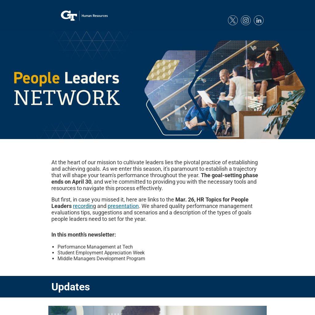 The Middle Management Framework will offer distinct tracks, addressing essential skills such as hiring practices, performance management, team leadership, conflict resolution, and topics related to engagement and well-being. These tracks will be tailored specifically for Georgia Tech's non-executive level people managers.