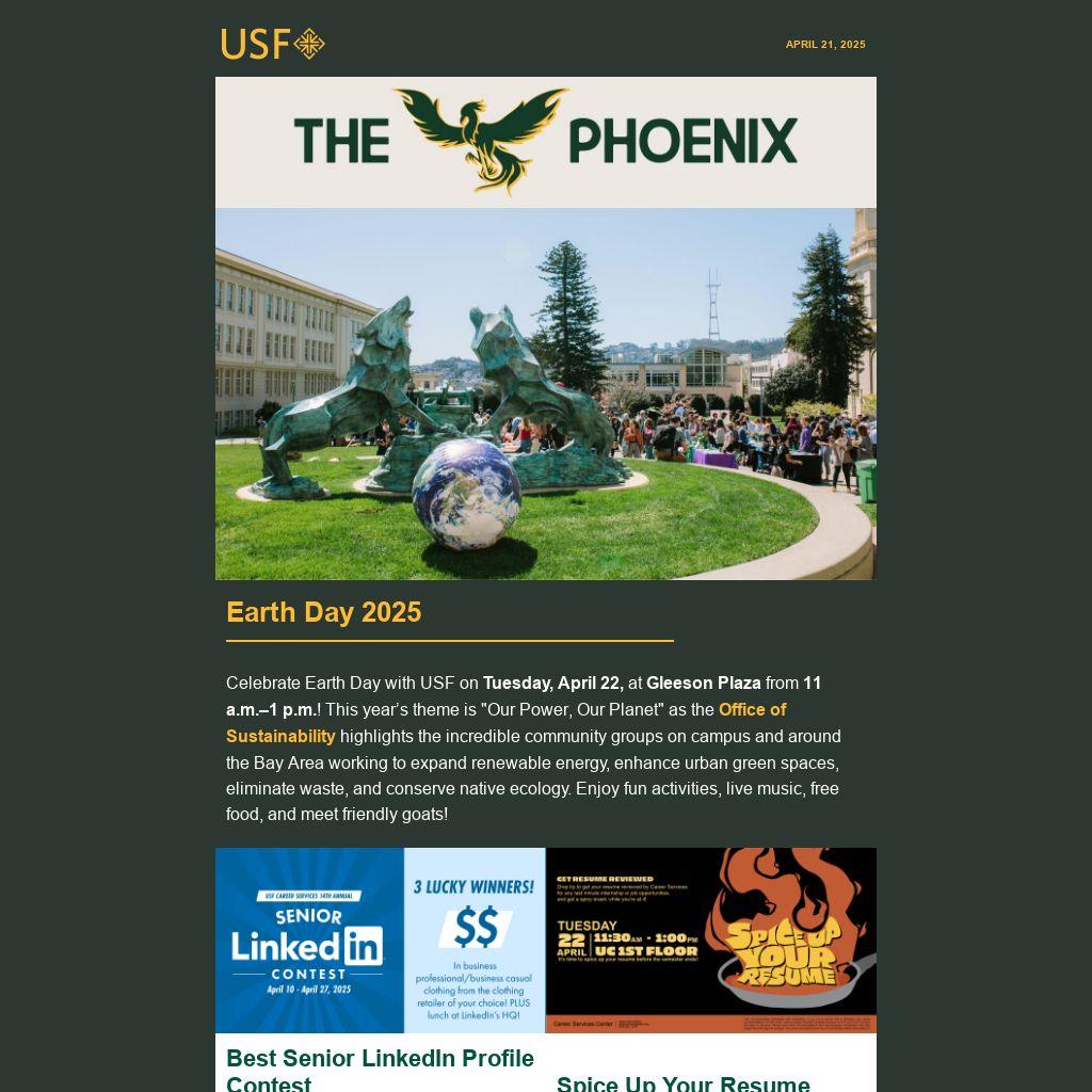 The Phoenix is a weekly e-newsletter sent by Student Leadership and Engagement to help students stay connected and get involved. It features campus events, leadership opportunities, athletic games, workshops, retreats, and more. Why “The Phoenix” title? The Phoenix has long been associated with the history and growth of USF as well as St. Ignatius, who encouraged followers to “go forth and set the world on fire.” Learn more »