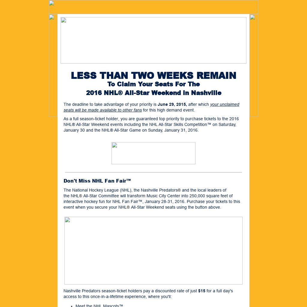 As a full season-ticket holder, you are guaranteed top priority to purchase tickets to the 2016 NHL® All-Star Weekend events including the NHL All-Star Skills Competition™ on Saturday, January 30 and the NHL® All-Star Game on Sunday, January 31, 2016.