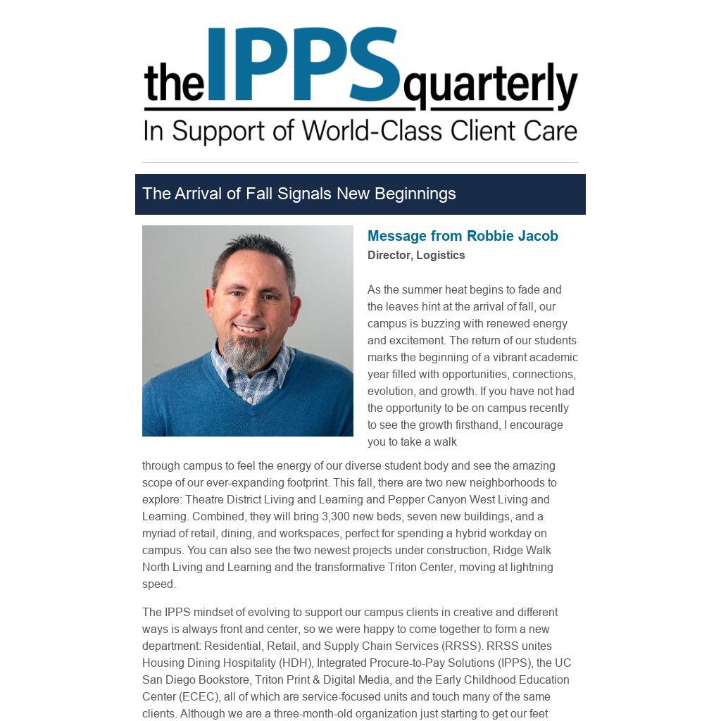 The IPPS mindset of evolving to support our campus clients in creative and different ways is always front and center, so we were happy to come together to form a new department: Residential, Retail, and Supply Chain Services (RRSS). RRSS unites Housing Dining Hospitality (HDH), Integrated Procure-to-Pay Solutions (IPPS), the UC San Diego Bookstore, Triton Print & Digital Media, and the Early Childhood Education Center (ECEC), all of which are service-focused units and touch many of the same clients. Although we are a three-month-old organization just starting to get our feet under us, our teams have already identified many opportunities for alignment and efficiency that will provide better experiences and possibly new offerings for you.