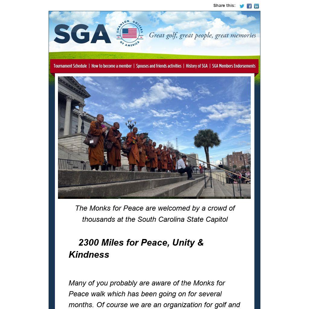 Many of you probably are aware of the Monks for Peace walk which has been going on for several months. Of course we are an organization for golf and for seniors, but once in a while a special event merits a newsletter for our great audience.