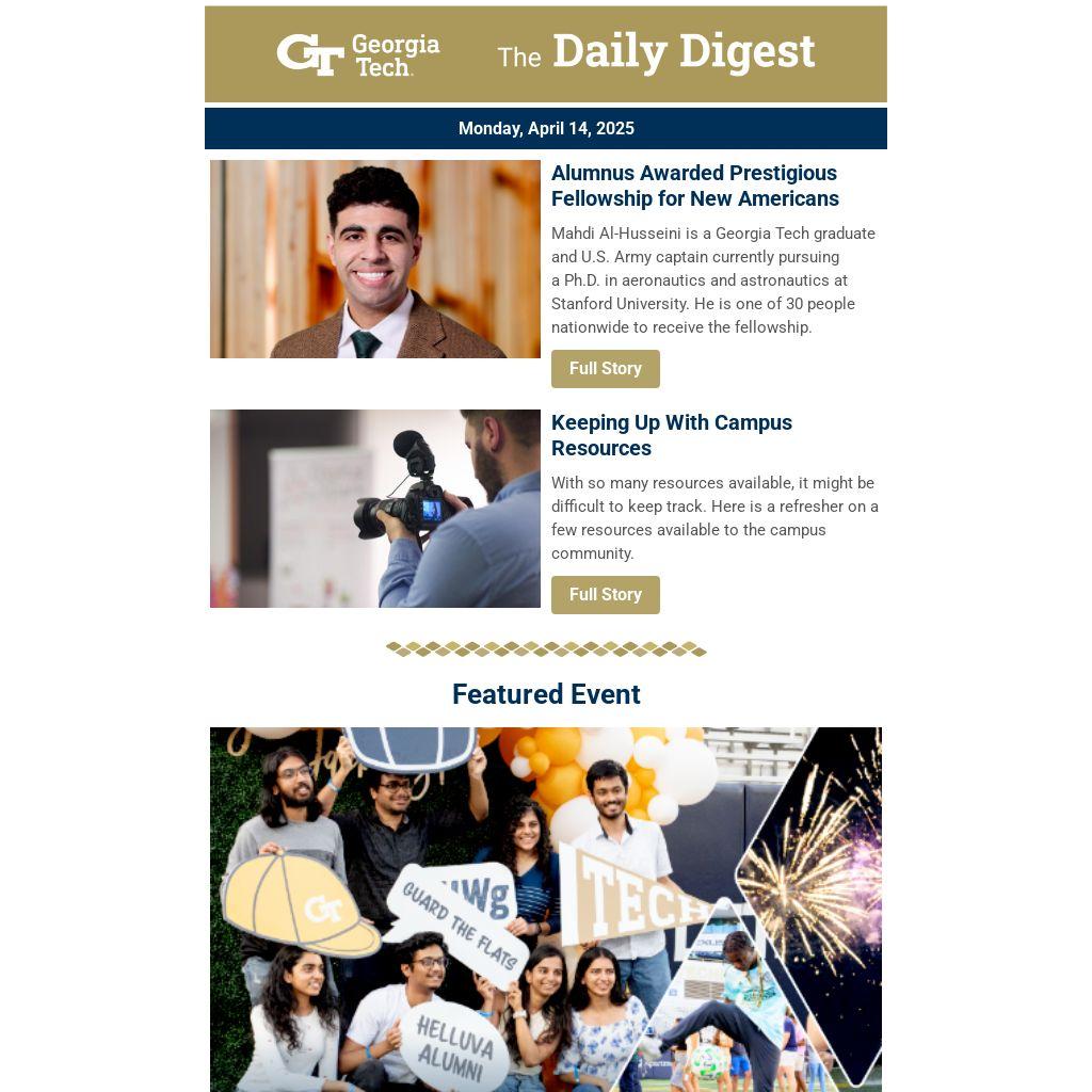 Join the Alumni Association on The Flats on April 17 for Ramblin’ On, an annual graduation celebration that welcomes graduates to a lifelong network of Jackets. Enjoy field games, photo ops, food, and drinks. Registration ends today.