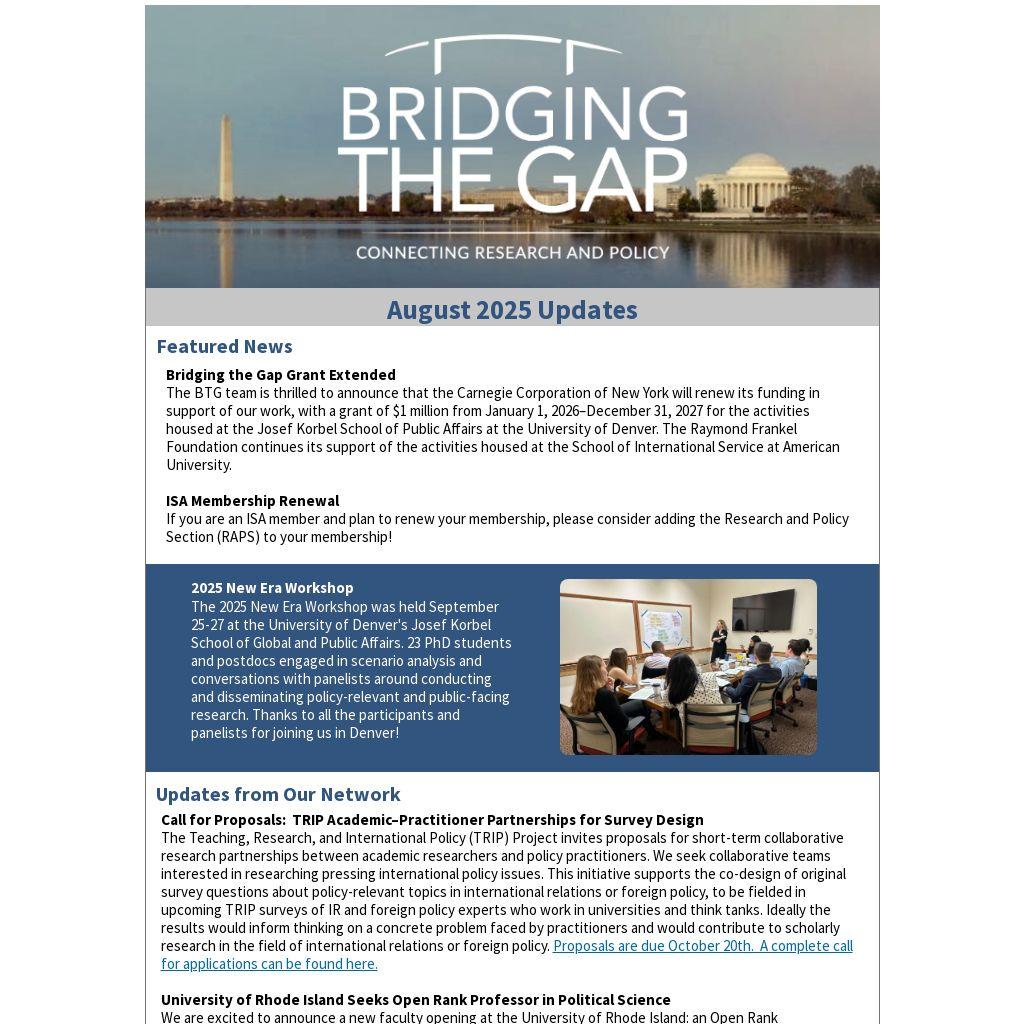 The BTG team is thrilled to announce that the Carnegie Corporation of New York will renew its funding in support of our work, with a grant of $1 million from January 1, 2026–December 31, 2027 for the activities housed at the Josef Korbel School of Public Affairs at the University of Denver. The Raymond Frankel Foundation continues its support of the activities housed at the School of International Service at American University.