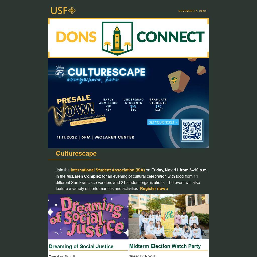 Join the International Student Association (ISA) on Friday, Nov. 11 from 6–10 p.m. in the McLaren Complex for an evening of cultural celebration with food from 14 different San Francisco vendors and 21 student organizations. The event will also feature a variety of performances and activities. Register now »